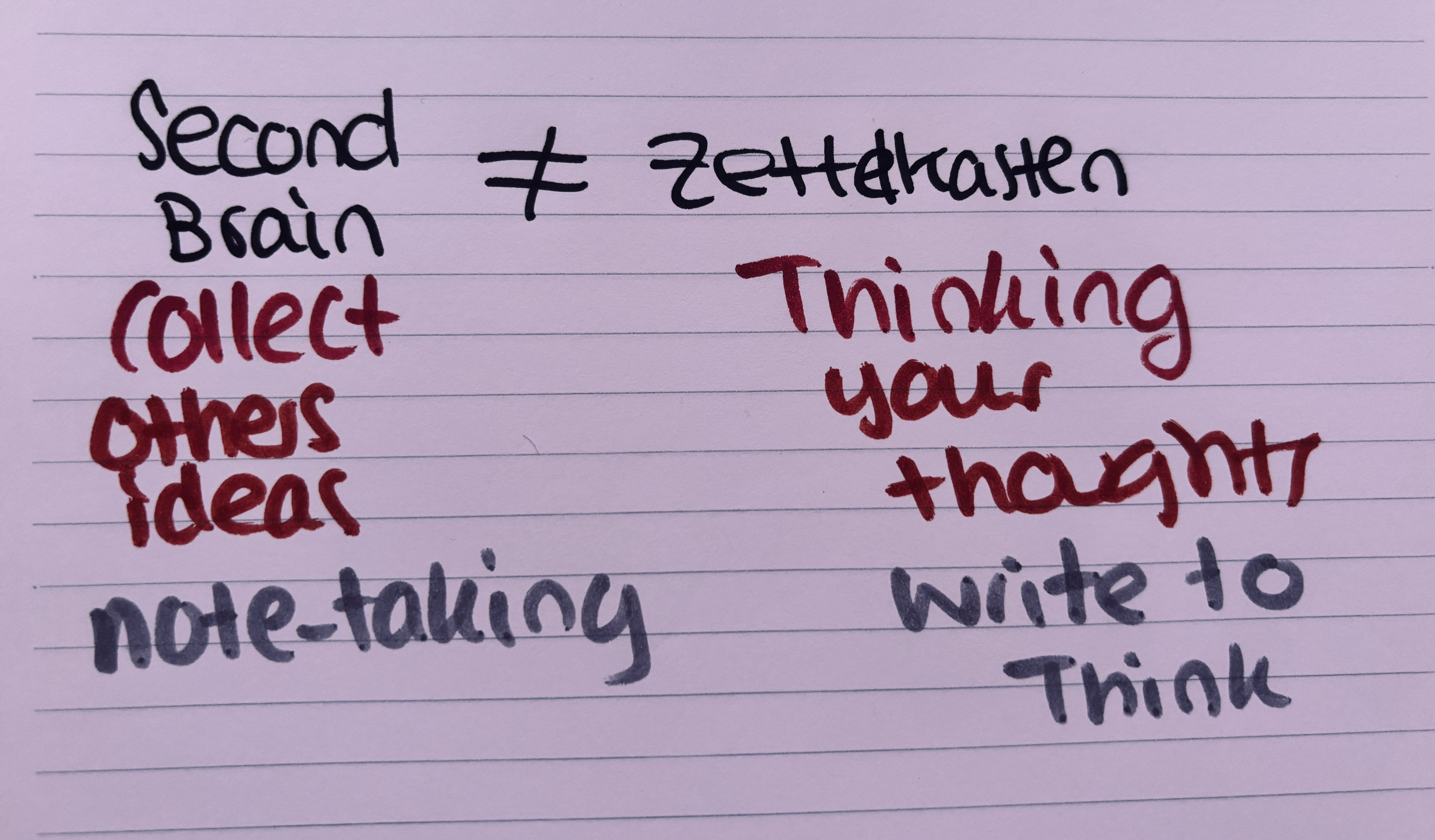 Example I saw a video on YouTube about somebody who had deleted his second brain. He described the relief he felt now that he was no longer hoarding information... and I made a note about how The Second Brain is different from the Zettelkasten because that was what struck me at the time. That the 'second brain' he was describing, was so different from my system.
