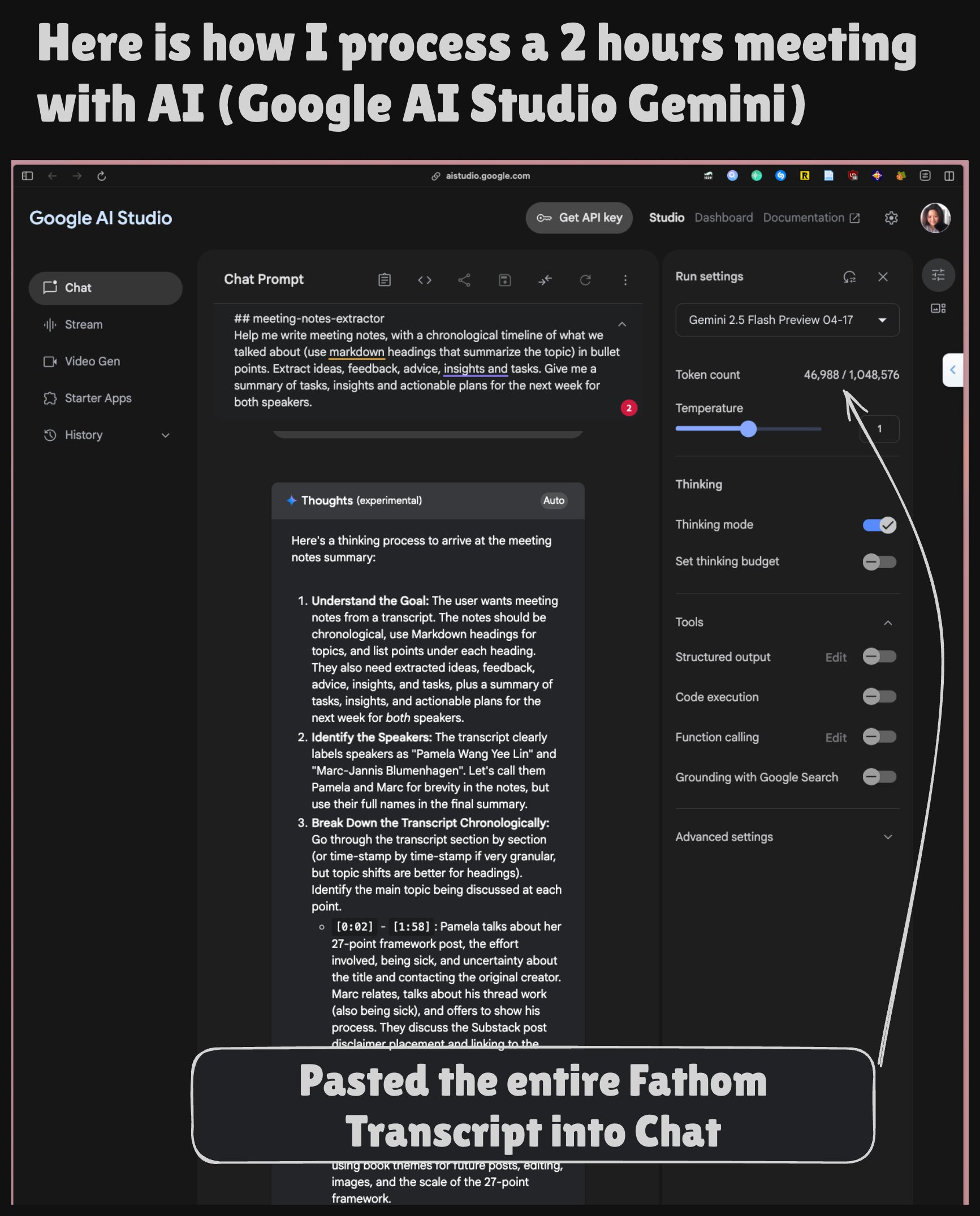 You might be wondering about the AI notetaker, and here is how I usually take the notes from a transcript and I get a bunch of insights, insights, tasks, advice. So anything that I mentioned that I would like to share during the meeting, I will be reminded to send you links or book names after the meeting.